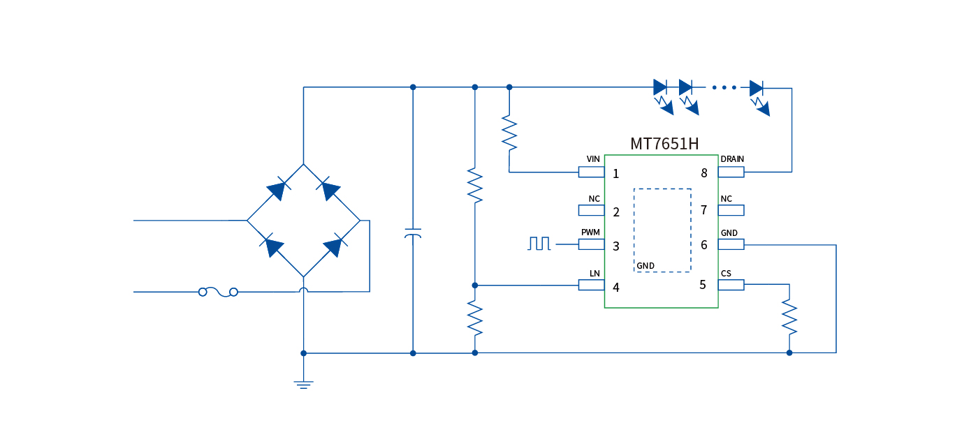 The MT7651H is a linear dimmable constant current LED driver IC, which can be widely used as the driver of dimmable light sources or lamps.