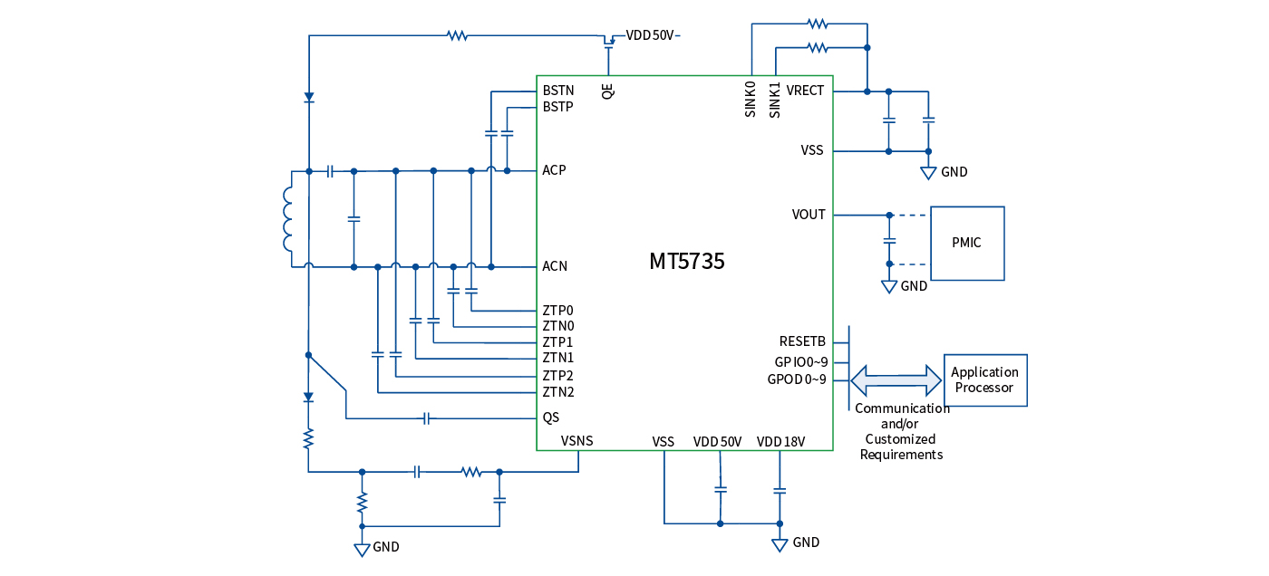 MT5735 is embedded with various protection features, such as FOD, over-voltage, over-current and over-temperature protection which guarantee the system reliability.